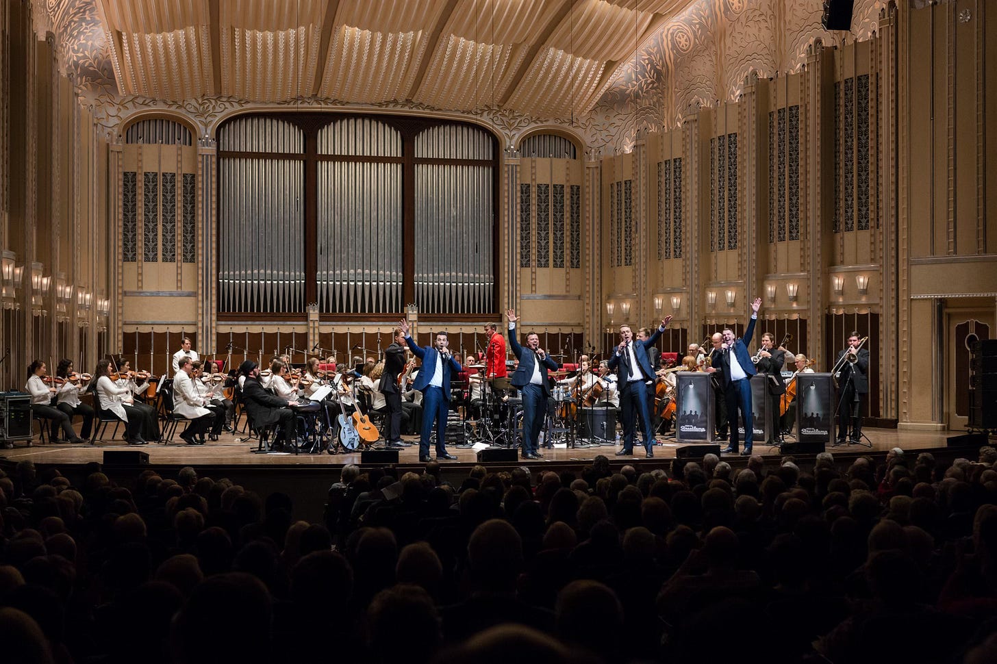 Four singers plus guitar, bass, drums, keys, trombone, trumpet, & sax